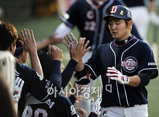 [아시아경제 김현민 기자]7일 서울 목동구장에서 열린 프로야구 두산 베어스와 넥센 히어로즈의 경기, 8회초 1사 1루에서 두산 최주환이 넥센 한현희를 상대로 투런홈런을 치고 동료들의 환영을 받고 있다.김현민 사진기자 kimhyun81@asiae.co.kr<ⓒ세계를 보는 창 경제를 보는 눈, 아시아경제(www.asiae.co.kr) 무단전재 배포금지>