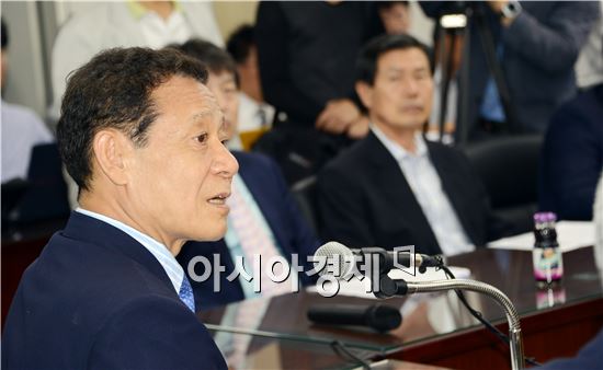 윤장현 광주시장 당선인이 9일 오후 광주도시공사 회의실에서 '민선6기 광주시 인수위원회' 출범 기자회견을 열고 향후 인수위 운영방안을 설명하고 있다. 윤 당선인 인수위원회 명칭을 '희망광주 준비위원회'로 명명했다. 이어 기자들의 질문에 답볍하는 윤장현 당선인