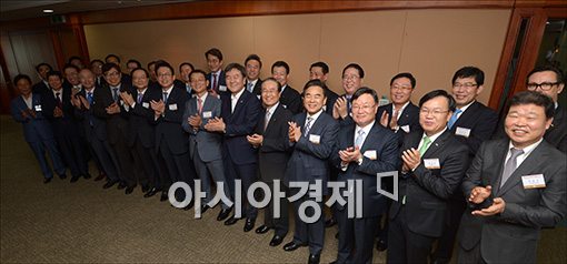 [아시아경제 윤동주 기자] 아시아경제신문과 아시아경제 팍스TV 주최로 10일 서울 여의도 금융투자협회에서 열린 '제1회 글로벌자산배분포럼'에 참석한 주요 인사들이 기념 사진을 찍고 있다. 이태재 NH-CA 공동대표(아래줄 왼쪽 끝부터), 강대석 신한금융투자 사장, 서명석 동양증권 사장, 정연대 코스콤 사장, 박재식 한국증권금융 사장, 최경수 한국거래소 이사장, 정우택 국회의원, 이세정 대표, 신제윤 금융위원회 위원장, 박종수 금융투자협회 회장, 김화진 사학연금 이사장, 김원규 우리투자증권 사장, 변재상 미래에셋증권 사장, 박종인 국장, 필립 페르슈롱 NH-CA 공동대표, 윤창현 한국금융연구원장, 나재철 대신증권 사장, 이광열 동부증권 부사장, 권용원 키움증권 사장, 김기범 KDB대우증권 사장, 유재훈 한국예탁결제원 사장, 김용범 메리츠종금증권 사장, 차문현 펀드온라인코리아 대표, 이동엽 금융감독원 부원장보, 정찬형 한국투자신탁운용 사장, 조용병 신한BNP파리바자산운용 사장, 박래신 한국투자밸류자산운용 사장, 이희권 KB자산운용 사장, 최만연 블랙록 한국 사장, 안병호 NH농협증권 사장.윤동주 기자 doso7@asiae.co.kr<ⓒ세계를 보는 창 경제를 보는 눈, 아시아경제(www.asiae.co.kr) 무단전재 배포금지>