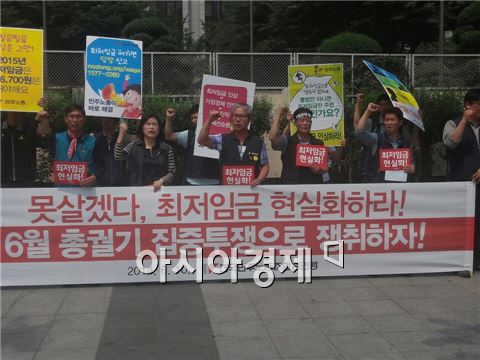 ▲10일 오전11시 서울 세종로 정부종합청사 앞에서 신승철 민주노총 위원장 등 노동계인사들이 최저임금 현실화를 요구하는 기자회견을 개최했다.