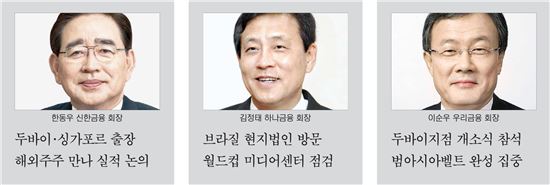 11일 금융권에 따르면 이순우 우리금융지주 회장은 우리은행 두바이 지점 개소식에 참석하기 위해 9일 중동행 비행기를 탔다. 우리은행은 두바이 지점 개소를 바탕으로 중국에서 동남아시아, 중동을 아우르는 범아시아벨트를 완성한다는 계획이다. 이는 해외 수익비중을 15%까지 늘리겠다는 이 회장의 계획에서 중요한 부분을 차지한다.한동우 신한금융지주 회장도 9일부터 13일까지 싱가포르와 두바이를 연달아 방문한다. 논딜로드쇼(NDR, Non-Deal Roadshow) 일환으로 한 회장은 싱가포르 투자청, 사우디아라비아 투자청 등 해외 주요 주주를 만나 올 1ㆍ4분기 실적과 향후 전망에 대해 논의할 예정이다. 또 제휴 관계사인 BNP파리바 두바이지점을 방문해 중동 시장에 대한 보고를 받을 예정이다. 신한지주는 지난해부터 BNP파리바 두바이지점에 신한은행 직원을 파견해 중동지역 시장조사를 하고 있다.김정태 하나금융그룹 회장은 주초 브라질 포스두이구아수로 향했다. 김 회장은 하나은행 '코리아 하우스'를 둘러보고 개소식에 참석한다. 코리아 하우스는 브라질 월드컵을 취재하는 국내 취재진을 지원하기 위해 설치한 미디어 센터다. 김 회장은 더불어 상파울로에 위치한 외환은행 현지법인을 둘러볼 계획이다. 산업은행 외에 브라질에 현지법인이나 지점을 둔 시중은행은 외환은행과 우리은행 뿐이다.이같이 금융수장들이 지방선거 종료가 기다렸다는 듯이 해외출장에 나선 것은 국내시장에서의 수익성이 갈수록 악화되는 상황에서 더 이상 해외시장 개척을 미룰 수 없다는 판단 때문으로 풀이된다.올 1분기 KB국민ㆍ신한ㆍ우리ㆍ하나 등 4대 금융그룹의 순이자마진(NIM)은 평균 2.09%를 기록했다. 글로벌 금융위기 이후 좀처럼 나아지지 않는데다 이미 전체 은행의 NIM은 1분기 1.80%로 떨어져 2009년 2분기(1.72%) 이후 최저 수준이다. 예대마진을 통한 전통적인 수익구조로는 은행의 성장 동력을 끌어올리기 어려운 상황에 처한 것이다. 이 때문에 서진원 신한은행장이 5월 인도네시아를 방문하고 권선주 기업은행장도 2월과 4월, 중국과 홍콩을 연달아 방문하는 등 금융수장의 해외영업이 올 들어 활기를 띠어 왔다.다만, 해외점포 역시 수익성에서 뚜렷한 답을 내지 못하고 있다는 점은 부담이다. 지난해 말 국내은행은 34개국에 152개의 해외점포를 운영 중인 것으로 집계돼 전년 대비 총 10개 점포가 늘었다. 하지만 당기순이익은 4억5000만달러로 전년과 비교해 1억8000만달러(28.8%)나 줄었다. 지역별로는 미국을 제외한 모든 나라에서 순익이 감소했다. 올 1분기에는 해외지점 실적이 크게 개선됐지만 부실채권 정리 영향이 크고 여전히 NIM도 하락추세를 보이고 있다.시중은행 관계자는 "각 은행들이 글로벌 수익확대를 위해 종전에 취했던 선진국 중심 영업에서 중동이나 브라질, 아프리카 등 신흥국으로 발길을 돌리고 있다"며 "일정기간 투자가 필요한 만큼 장기적 관점에서 접근하는 전략이 바람직하다"고 밝혔다.이장현 기자 inside@asiae.co.kr<ⓒ세계를 보는 창 경제를 보는 눈, 아시아경제(www.asiae.co.kr) 무단전재 배포금지>