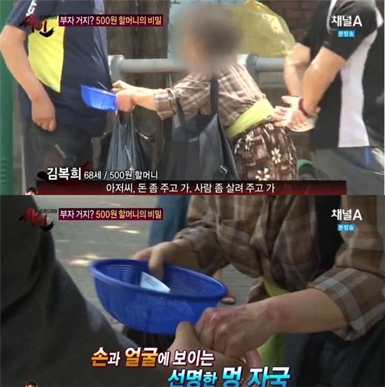 [아시아경제 온라인이슈팀] '명품 치장' 500원 할머니, 아들 폭행 흔적 발견 "왜?"거리에서 '500원만 달라'고 구걸하는 일명 '500원 할머니'의 사연이 공개돼 궁금증을 자아내고 있다. 10일 방송된 채널A 모큐드라마 '싸인'에서는 500원 할머니 김복희(68)씨의 이중생활이 공개됐다. 최근 종로 일대 상인들 사이에서 행인들에게 500원만 달라고 구걸하는 김씨가 사실은 두 채의 건물과 별장까지 가지고 있는 알부자라는 소문이 떠돌았다. 제작진은 소문의 진상을 파악하기 위해 할머니를 관찰하던 중 충격적인 광경을 목격했다. 걸인 차음으로 한 공원 화장실에 들어간 할머니가 고급스러운 옷과 고가의 귀금속으로 치장한 채 나온 것이다. 또 가족이 없다던 할머니 말과 달리 손자를 만나는 모습까지 포착됐다. 거리에서 생활한다던 할머니는 전셋집이 있는 것은 물론, 얼마 전까지 자기 이름의 집을 갖고 있었다. 구걸 생활을 하는 이유를 알기 위해 500원 할머니의 집을 찾아간 제작진은 쓰러져 있는 할머니를 발견하고, 급히 병원으로 옮겼다. 가족들에게 연락하지 말라는 할머니의 만류가 있었지만 제작진은 아들에게 연락해 할머니를 돌려보냈다.그런데 얼마 지나지 않아 할머니는 다시 거리로 나와 구걸을 시작했다. 충격적인 것은 할머니 몸에 보이는 폭행의 흔적이었다. 제작진이 아들의 집 주변 주민들을 취재한 결과, 아들이 술만 마시면 할머니뿐 아니라 아내에게도 끔찍한 폭력을 행사한다는 사실이 밝혀졌다.하지만 할머니는 끝까지 아들의 폭행에 대해서는 함구해 안타까움을 자아냈다.한편, 모큐드라마 '싸인'은 실제 있었던 사건 등을 소재로 허구의 상황을 실제 상황처럼 가공해 만든 프로그램으로 상황을 실감나게 전달하기 위해 재연 또는 인터뷰의 형식을 삽입하기도 한다.500원 할머니 사연에 네티즌은 "500원 할머니, 그래서 제작진은 뭘 한거야" "500원 할머니, 제작진이 억지로 아들한테 돌려보내서 할머니가 맞은 건가?" "500원 할머니, 안타까워하고 끝났어?" 등의 반응을 보였다. 온라인이슈팀 <ⓒ세계를 보는 창 경제를 보는 눈, 아시아경제(www.asiae.co.kr) 무단전재 배포금지>