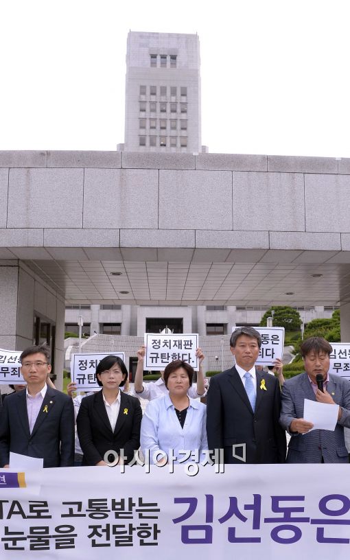 [아시아경제 최우창 기자]국회에서 최루탄을 투척한 혐의로 기소된 통합진보당 김선동 의원이 징역 1년에 집행유예 2년을 선고 받은 12일 오후 서울 서초구 대법원 앞에서 기자회견을 하고 있다.최우창 기자 smicer@asiae.co.kr<ⓒ세계를 보는 창 경제를 보는 눈, 아시아경제(www.asiae.co.kr) 무단전재 배포금지>