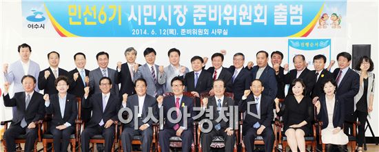 여수시 민선6기 시민시장준비위원회(이하 준비위)는 12일 오전 오림동 진남스포츠센터 2층 회의실에서 공식 출범식을 갖고 기념촬영을 하면서 파이팅을 외치고 있다.<br />