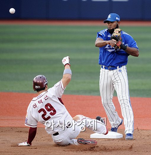 [아시아경제 김현민 기자] 12일 서울 목동구장에서 열린 프로야구 삼성 라이온즈와 넥센 히어로즈의 경기, 삼성 2루수 나바로가 1회말 1사 1루 넥센 유한준의 내야땅볼 때 1루주자 이택근을 포스아웃시키고 1루로 송구하고 있다.김현민 사진기자 kimhyun81@asiae.co.kr<ⓒ세계를 보는 창 경제를 보는 눈, 아시아경제(www.asiae.co.kr) 무단전재 배포금지>