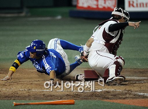 [아시아경제 김현민 기자] 12일 서울 목동구장에서 열린 프로야구 삼성 라이온즈와 넥센 히어로즈의 경기, 8회초 1사 2,3루에서 삼성 박해빈의 투수 앞 땅볼 때 홈으로 쇄도한 3루주자 박석민이 넥센 허도환 포수에게 태그아웃되고 있다.김현민 사진기자 kimhyun81@asiae.co.kr<ⓒ세계를 보는 창 경제를 보는 눈, 아시아경제(www.asiae.co.kr) 무단전재 배포금지>