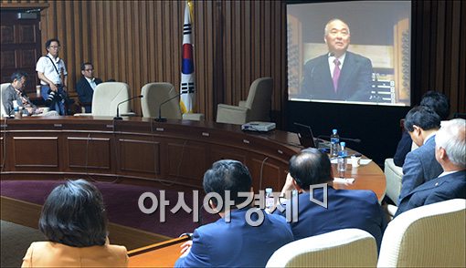 ▲13일 서울 여의도 국회에서 열린 새누리당 주요당직자회의에서 의원들이 논란이 되고 있는 문창극 국무총리 후보자의 동영상을 보고 있다.