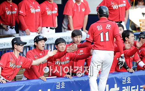 [아시아경제 김현민 기자] 14일 서울 송파구 잠실구장에서 열린 프로야구 SK 와이번스와 LG 트윈스의 경기, 4회초 2사 1,2루에서 SK 박윤의 동점 1타점 적시타 때 득점을 올린 2루주자 임훈이 동료들과 하이파이브하고 있다.김현민 사진기자 kimhyun81@asiae.co.kr<ⓒ세계를 보는 창 경제를 보는 눈, 아시아경제(www.asiae.co.kr) 무단전재 배포금지>