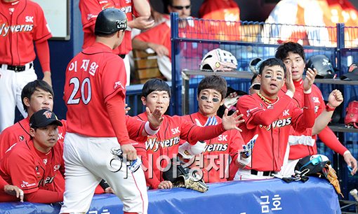 [아시아경제 김현민 기자] 14일 서울 송파구 잠실구장에서 열린 프로야구 SK 와이번스와 LG 트윈스의 경기, 4회초 2사 1,3루에서 SK 박계현의 역전 1타점 적시타 때 득점을 올린 3루주자 이재원이 동료들의 환영을 받고 있다.김현민 사진기자 kimhyun81@asiae.co.kr<ⓒ세계를 보는 창 경제를 보는 눈, 아시아경제(www.asiae.co.kr) 무단전재 배포금지>