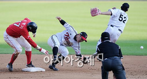 [아시아경제 김현민 기자] 14일 서울 송파구 잠실구장에서 열린 프로야구 SK 와이번스와 LG 트윈스의 경기, 5회초 무사 1루에서 SK 조동화의 투수 앞 땅볼 때 2루로 송구 된 볼이 높아 뒤로 빠지고 있다.김현민 사진기자 kimhyun81@asiae.co.kr<ⓒ세계를 보는 창 경제를 보는 눈, 아시아경제(www.asiae.co.kr) 무단전재 배포금지>