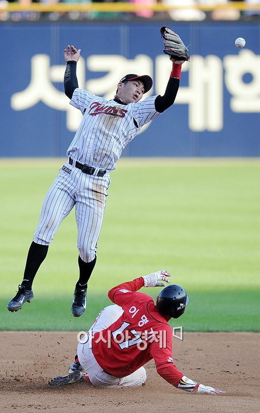 [아시아경제 김현민 기자] 14일 서울 송파구 잠실구장에서 열린 프로야구 SK 와이번스와 LG 트윈스의 경기, 5회초 무사 1루에서 SK 조동화의 투수 앞 땅볼 때 2루로 송구 된 볼이 높아 뒤로 빠지고 있다.김현민 사진기자 kimhyun81@asiae.co.kr<ⓒ세계를 보는 창 경제를 보는 눈, 아시아경제(www.asiae.co.kr) 무단전재 배포금지>