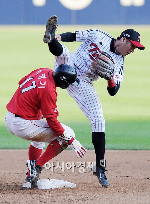 [아시아경제 김현민 기자] 14일 서울 송파구 잠실구장에서 열린 프로야구 SK 와이번스와 LG 트윈스의 경기, 5회초 무사 1루에서 SK 조동화의 투수 앞 땅볼 때 LG 오지환이 높게 송구된 볼을 놓치며 SK 이명기와 충돌하고 있다.김현민 사진기자 kimhyun81@asiae.co.kr<ⓒ세계를 보는 창 경제를 보는 눈, 아시아경제(www.asiae.co.kr) 무단전재 배포금지>