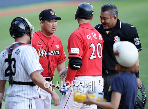 [아시아경제 김현민 기자] 14일 서울 송파구 잠실구장에서 열린 프로야구 SK 와이번스와 LG 트윈스의 경기, 5회초 무사 2루에서 SK 이재원이 LG 선발 리오단의 위협구에 놀라 넘어지자 이만수 감독이 그라운드로 나와 상태를 확인하고 있다.김현민 사진기자 kimhyun81@asiae.co.kr<ⓒ세계를 보는 창 경제를 보는 눈, 아시아경제(www.asiae.co.kr) 무단전재 배포금지>