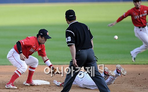 [아시아경제 김현민 기자] 14일 서울 송파구 잠실구장에서 열린 프로야구 SK 와이번스와 LG 트윈스의 경기, 5회말 2사 1루에서 LG 백창수 타석 때 1루주자 채은성이 2루 도루에 성공하고 있다. SK 유격수는 나주환.김현민 사진기자 kimhyun81@asiae.co.kr<ⓒ세계를 보는 창 경제를 보는 눈, 아시아경제(www.asiae.co.kr) 무단전재 배포금지>