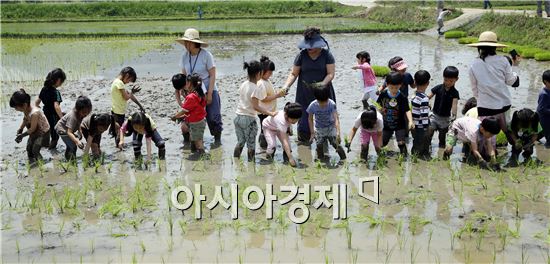 전남 강진군 성전면 ‘강진 자연과 유기농영농조합법인’이 마련한 친환경체험행사에 초청된 광주전남 생태유아공동체 어린이집 원생들이 친환경 손 모내기 체험을 하고 있다.