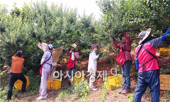 "공무원 43개부서 530여명, 유관기관 24개 단체 384명 참여 " [아시아경제 노해섭 기자]순천시 공무원들이 농촌일손 돕기에 발 벗고 나섰다.순천시는 농촌인력의 고령화, 부녀화로 인건비 상승 등 이중적 부담을 안고 있는 농촌의 현실을 감안해 부서별로 노약자, 병고자 등 취약 농가를 대상으로 선정, 일손 돕기에 나서고 있다.현재까지 순천시청 산하 43개부서 530여명이 농촌인력 감소로 어려움에 처해있는 농업인들의 고충을 함께 나누고자 관내 일손부족농가의 매실, 감자 수확 및 과수 적과 작업에 참여했다.또한 읍면동 이통장, 주민자치위원, 부녀회 등 유관기관 24개 단체 384명도 농촌일손 돕기에 동참했다. 앞으로도 순천시 공무원 20회 220여명, 유관기관 5회 30여명이 농촌일손 돕기에 참여할 예정이다.시 관계자는 "더 많은 봉사자들과 기관단체의 참여를 유도해 지역농민들의 일손부족이 해소될 수 있도록 노력하겠다"고 했다. 한편, 일손 돕기를 지원받고자 하는 농가나 지원을 희망하는 단체들은 시 친환경농축산과나 읍·면에 설치된 일손 돕기 알선 창구를 통하여 농촌 일손 돕기에 참여할 수 있다.기타 자세한 사항은 시 친환경농축산과(061-749-8711)로 문의하면 된다.노해섭 기자 nogary@<ⓒ세계를 보는 창 경제를 보는 눈, 아시아경제(www.asiae.co.kr) 무단전재 배포금지>
