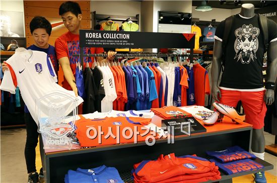 (주)광주신세계(대표이사 유신열) 6층 스포츠 브랜드 나이키 매장에서는 붉은색과 흰색 상의와 짙은 파란색 하의로 디자인되어, 음과 양이 조화된 태극문양을 역동으로 표현한 대한민국 축구 국가대표 유니폼을 선보이고 있다.<br /> <br /> 국가대표 유니폼은 3개월부터 36개월까지 착용 가능한 키즈세트 79,000원, 성인유니폼 상의 99,000원, 하의 49,000원이다. 사진제공=광주신세계