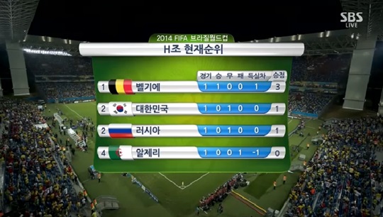 ▲H조 조별리그 순위표(사진: SBS 경기영상 캡처)