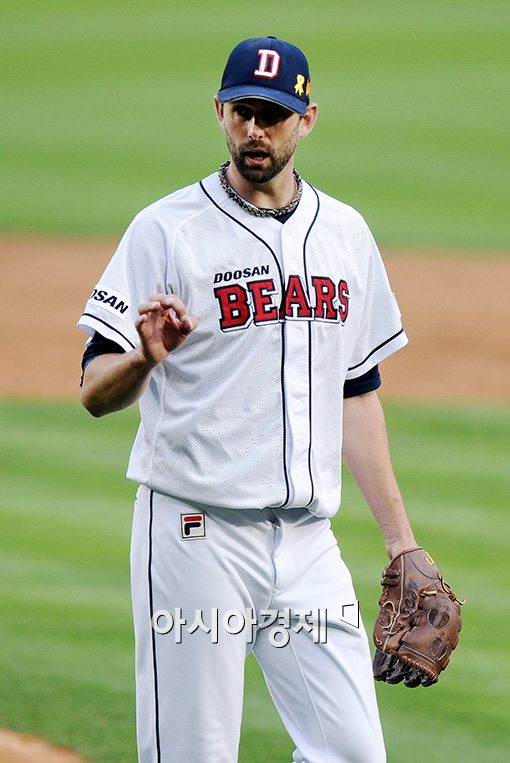 [아시아경제 김현민 기자]18일 오후 서울 잠실구자에서 열린 2014 프로야구 LG 트윈스와 두산 베어스의 경기, 두산 선발 니퍼트가 3회초 수비를 무실점으로 막고 덕아웃으로 향하며 양의지 포수를 향해 손짓하고 있다.김현민 사진기자 kimhyun81@asiae.co.kr<ⓒ세계를 보는 창 경제를 보는 눈, 아시아경제(www.asiae.co.kr) 무단전재 배포금지>