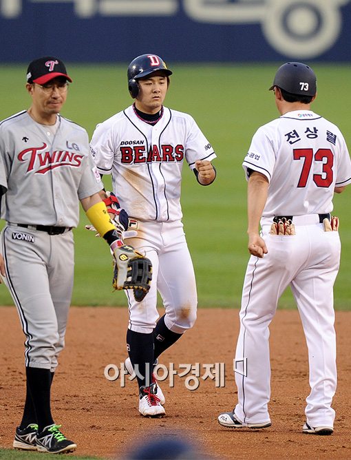 [아시아경제 김현민 기자]18일 오후 서울 잠실구자에서 열린 2014 프로야구 LG 트윈스와 두산 베어스의 경기, 3회말 1사 만루에서 두산 최주환이 추가 2타점 2루타를 치고 전상렬 코치와 하이파이브하고 있다.김현민 사진기자 kimhyun81@asiae.co.kr<ⓒ세계를 보는 창 경제를 보는 눈, 아시아경제(www.asiae.co.kr) 무단전재 배포금지>