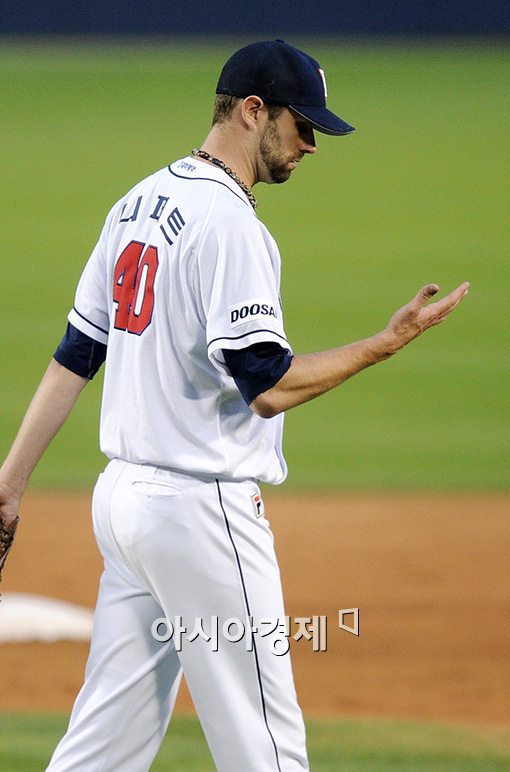 [아시아경제 김현민 기자]18일 오후 서울 잠실구자에서 열린 2014 프로야구 LG 트윈스와 두산 베어스의 경기, 두산 선발투수 니퍼트가 4회초 LG 선두타자 박용택의 투수 강습타구를 맨손으로 잡으려다 놓친 뒤 상태를 체크하고 있다.김현민 사진기자 kimhyun81@asiae.co.kr<ⓒ세계를 보는 창 경제를 보는 눈, 아시아경제(www.asiae.co.kr) 무단전재 배포금지>