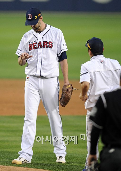 [아시아경제 김현민 기자]18일 오후 서울 잠실구자에서 열린 2014 프로야구 LG 트윈스와 두산 베어스의 경기, 두산 선발투수 니퍼트가 4회초 LG 선두타자 박용택의 투수 강습타구를 맨손으로 잡으려다 놓친 뒤 상태를 체크하고 있다.김현민 사진기자 kimhyun81@asiae.co.kr<ⓒ세계를 보는 창 경제를 보는 눈, 아시아경제(www.asiae.co.kr) 무단전재 배포금지>