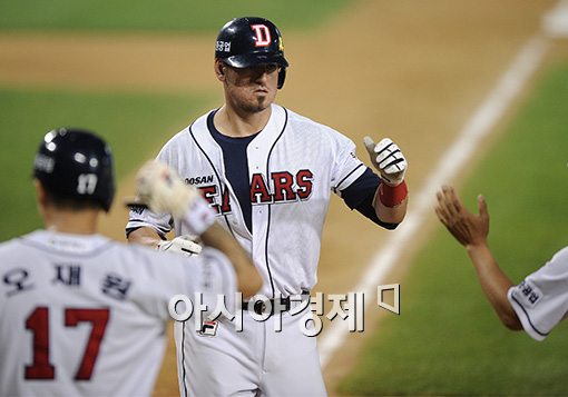 [아시아경제 김현민 기자]18일 오후 서울 잠실구장에서 열린 프로야구 LG 트윈스와 두산 베어스의 경기, 8회말 1사 2루에서 두산 칸투가 투런홈런을 치고 선행주자의 환영을 받고 있다.김현민 사진기자 kimhyun81@asiae.co.kr<ⓒ세계를 보는 창 경제를 보는 눈, 아시아경제(www.asiae.co.kr) 무단전재 배포금지>