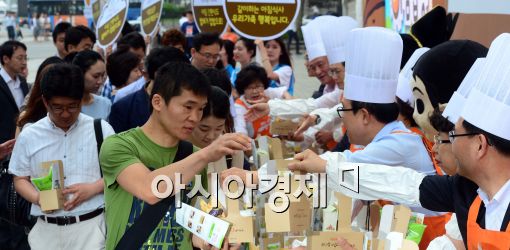 [아시아경제 최우창 기자]농협중앙회와 농림축산식품부 직원들이 19일 서울 일민미술관 앞에서 출근길 시민들에게 '쌀 소비촉진 아침밥 먹기 캠페인'을 하며 쌀로 만든 간편 아침을 나눠주고 있다.이번 캠페인은 2020년까지 1인당 연간 쌀 소비량을 70kg 이상으로 유지하기 위해 농협이 추진 중인 쌀 소비촉진 운동 '2070 프로젝트'의 일환이다.최우창 기자 smicer@asiae.co.kr<ⓒ세계를 보는 창 경제를 보는 눈, 아시아경제(www.asiae.co.kr) 무단전재 배포금지>