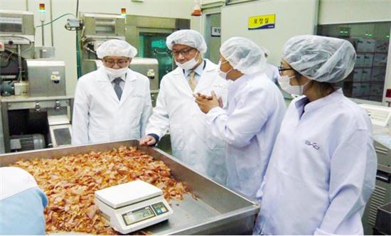 김영학 한국무역보험공사 사장(왼쪽 두번째)이 지난 13일 경북 청도군의 수산물 가공업체를 방문해 최근 업황 및 수출 애로사항을 듣고 적극적인 무역보험 지원을 약속하고 있다.