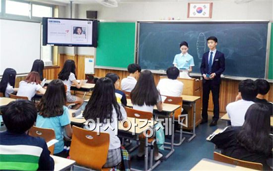 호남대학교 항공서비스학과(학과장 이동희)는 18일 광주광역시 광산구 수등로 장덕고등학교(교장 조대호)에서 진로지도 특강을 실시했다. <br /> <br /> 이 날 항공서비스학과 한의진 교수는 스튜어디스 분야에 관심 있는 학생 20여명을 대상으로 ‘항공승무원의 세계’를 주제로 강의를 실시해 항공승무원의 유래, 승무원의 역할, 자질, 승무원의 혜택 등에 대해 설명했다. <br /> <br /> 이날 특강에 참여한 학생들은 진로에 대해 구체적인 정보를 접하고 자신의 진로에 한 발짝 다가가는 시간을 가졌다.<br />