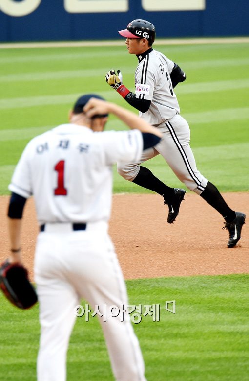[아시아경제 김현민 기자]19일 오후 서울 잠실구장에서 열린 프로야구 LG 트윈스와 두산 베어스의 경기, 1회초 무사 1루에서 LG 오지환이 두산 선발 이재우를 상대로 우월 선제 투런 홈런을 치고 베이스를 돌고 있다.김현민 사진기자 kimhyun81@asiae.co.kr<ⓒ세계를 보는 창 경제를 보는 눈, 아시아경제(www.asiae.co.kr) 무단전재 배포금지>