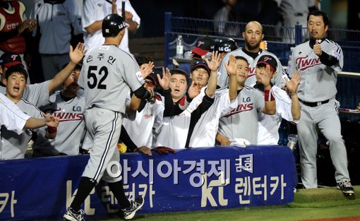 [아시아경제 김현민 기자]19일 오후 서울 잠실구장에서 열린 프로야구 LG 트윈스와 두산 베어스의 경기, 5회초 LG 선두타자 손주인 좌월 솔로 홈런을 치고 동료들의 환영을 받고 있다.김현민 사진기자 kimhyun81@asiae.co.kr<ⓒ세계를 보는 창 경제를 보는 눈, 아시아경제(www.asiae.co.kr) 무단전재 배포금지>