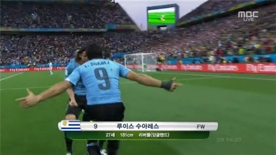 ▲우루과이가 수아레즈의 맹활약 속에 잉글랜드에 2-1 승리를 거뒀다. (사진: MBC 중계영상 캡처)
