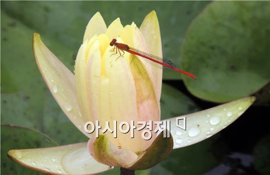 촉촉한 비가 내리는 가운데 주말인 21일 전남 함평군 월야면 달맞이 공원에서 실잠자리가 꽃망울을 터트린 수련꽃에 앉아 빗속에서 아름다운 자태를 뽐내고 있다.<br />