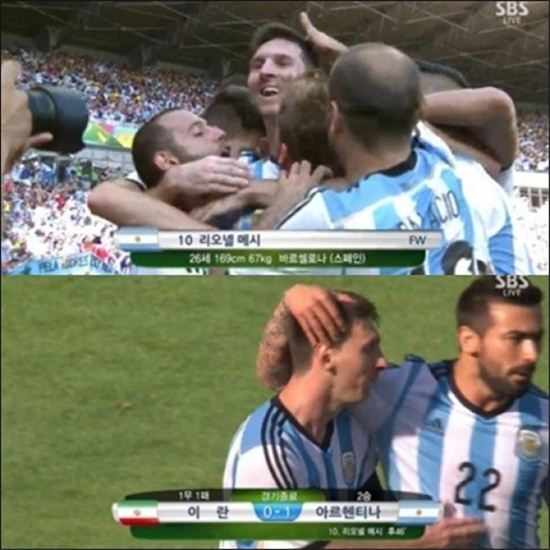 ▲디마리아가 후반 추가시간 교체돼 나가면서 이란의 '침대축구'를 역이용한 시간끌기를 선보였다. (사진: SBS 중계화면 캡처)