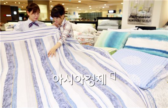 (주)광주신세계(대표이사 유신열) 지하 1층 파코라반 이불 매장에서는 표면이 오돌토돌하고 흡수성과 통기성이 좋아 여름철에 쾌적하게 사용할 수 있는 면 리플 소재의 여름 이불이 인기를 끌고 있다. <br /> <br /> 면 리플은 면 원단에 잔물결의 요철감을 준 소재로 주름과 꼬임 가공으로 만들며 피부에 닿는 면이 줄어 시원하게 덮을 수 있어서 피부가 약한 사람이나 어린이용 침구로 적합하다. 사진제공=광주신세계<br />