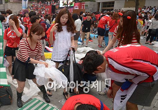 [아시아경제 윤동주 기자] 2014 브라질 월드컵 H조 조별리그 대한민국과 알제리의 경기가 끝난 23일 오전 서울 종로구 광화문 광장에서 거리응원을 하던 시민들이 주변을 정리하고 있다.윤동주 기자 doso7@asiae.co.kr<ⓒ세계를 보는 창 경제를 보는 눈, 아시아경제(www.asiae.co.kr) 무단전재 배포금지>