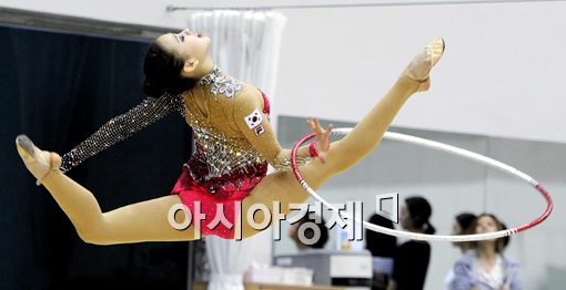 [아시아경제 김현민 기자]‘리듬체조 요정’ 손연재가 23일 오전 서울 태릉선수촌 리듬체조장에서 열린 '2014 리듬체조 국가대표 및 국제대회 파견대표 선발전'에서 후프 연기를 펼치고 있다.김현민 기자 kimhyun81@asiae.co.kr<ⓒ세계를 보는 창 경제를 보는 눈, 아시아경제(www.asiae.co.kr) 무단전재 배포금지>