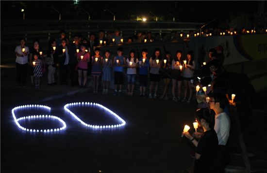 2013년 7월, 성북구 미아리고개 구름다리에서 열린 '정전협정 60주년 미아리고개 추모.평화의 밤'촛불 퍼포먼스 모습<br />