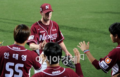 [대구=아시아경제 김현민 기자] 24일 대구 시민야구장에서 열린 프로야구 넥센 히어로즈와 삼성 라이온즈의 경기, 넥센 선발 밴헤켄이 5회말 수비를 마치고 덕아웃으로 향하며 동료들의 환영을 받고 있다. 밴헤켄은 5이닝 2실점하며 승리투수 요건을 갖췄다.김현민 기자 kimhyun81@asiae.co.kr<ⓒ세계를 보는 창 경제를 보는 눈, 아시아경제(www.asiae.co.kr) 무단전재 배포금지>