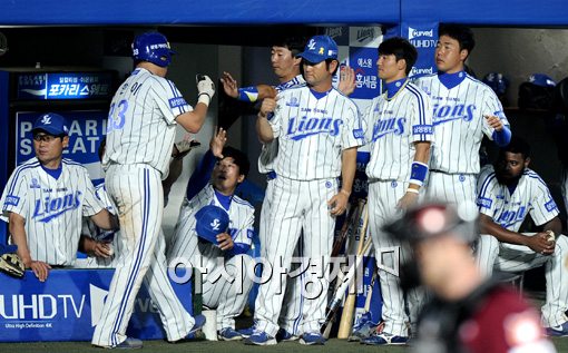 [대구=아시아경제 김현민 기자] 24일 대구 시민야구장에서 열린 프로야구 넥센 히어로즈와 삼성 라이온즈의 경기, 5회말 2사 1,2루에서 삼성 채태인의 1타점 적시타때 득점을 올린 박한이가 동료들의 환영을 받고 있다.김현민 기자 kimhyun81@asiae.co.kr<ⓒ세계를 보는 창 경제를 보는 눈, 아시아경제(www.asiae.co.kr) 무단전재 배포금지>