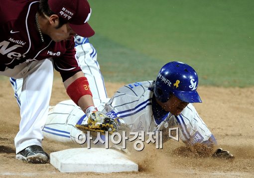[대구=아시아경제 김현민 기자] 24일 대구 시민야구장에서 열린 프로야구 넥센 히어로즈와 삼성 라이온즈의 경기, 6회말 무사 1루 삼성 이지영 타석 때 1루주자 박해민이 넥센 허도환 포수의 견제에 황급히 귀루하고 있다.김현민 기자 kimhyun81@asiae.co.kr<ⓒ세계를 보는 창 경제를 보는 눈, 아시아경제(www.asiae.co.kr) 무단전재 배포금지>