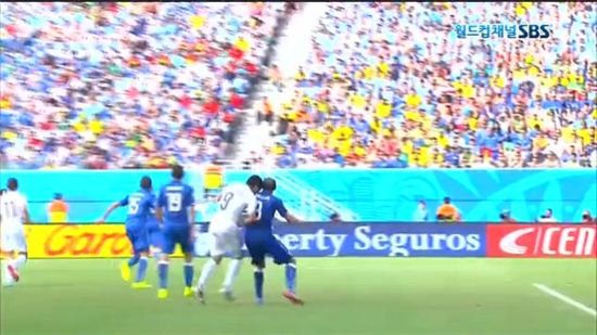 ▲우루과이와 이탈리아 경기 중 상대 어깨를 깨물고 있는 우루과이 수아레스(사진:SBS캡처)