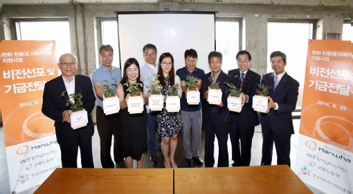 한화그룹이 친환경 사회적기업 14곳을 대상으로 기금 및 경영컨설팅 등을 지원한다. 25일 서울 마포구 동교동의 한 카페에서 강기수 한화그룹 커뮤니케이션팀장(맨 오른쪽), 이세중 함께 일하는 재단 상임이사(맨 왼쪽)가 올해 선정된 사회적기업 대표들과 친환경 사회적기업을 상징하는 화분을 들고 힘찬 도약을 다짐하고 있다.