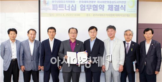2015광주하계유니버시아드대회 조직위원회(사무총장 김윤석)와 문화체육관광부 아시아문화중심도시추진단(단장 김성일)은 25일 조직위원회 회의실에서 ‘광주U대회 성공 개최’와 ‘아시아문화중심도시 광주 조성’을 위해 상호 업무지원을 약속하는 협약을 체결했다.<br />