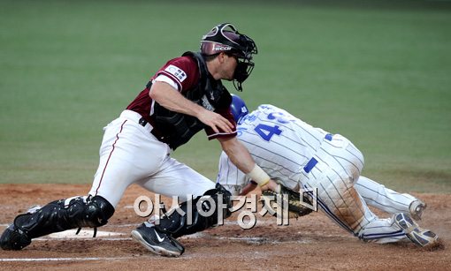 [대구=아시아경제 김현민 기자] 25일 대구 시민야구장에서 열린 프로야구 넥센 히어로즈와 삼성 라이온즈의 경기, 1회말 2사 2루에서 삼성 김상수의 우전안타 때 2루주자 이흥련이 홈으로 쇄도해 득점을 올리고 있다. 넥센 포수는 로티노.김현민 기자 kimhyun81@asiae.co.kr<ⓒ세계를 보는 창 경제를 보는 눈, 아시아경제(www.asiae.co.kr) 무단전재 배포금지>