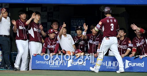 [대구=아시아경제 김현민 기자] 25일 대구 시민야구장에서 열린 프로야구 넥센 히어로즈와 삼성 라이온즈의 경기, 2회초 무사 1루에서 넥센 김민성이 삼성 배영수를 상대로 좌월 투런홈런을 치고 동료들의 환영을 받고 있다.김현민 기자 kimhyun81@asiae.co.kr<ⓒ세계를 보는 창 경제를 보는 눈, 아시아경제(www.asiae.co.kr) 무단전재 배포금지>