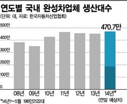 [아시아경제 최대열 기자] 올해 국내 자동차 생산대수가 470만대를 넘어서며 역대 가장 많은 수준을 기록할 것으로 예상된다.27일 한국자동차산업협회에 따르면 올해 들어 5월까지 국내 완성차업체가 생산한 차량은 총 196만2122대로 집계됐다. 지난해 같은 기간에 비해 4.1% 정도 늘어난 것으로 현재와 같은 추세를 이어간다면 올 한 해 470만대 이상을 생산할 것으로 추산된다. 이 같은 수치는 국내 완성차업체의 해외공장 생산분을 제외하고 현대차를 포함한 7개 업체의 생산량을 더한 것이다.업체별로 보면 현대차가 올 들어 지난달까지 82만1133대를 만들어 전년 동기 대비 8.8% 늘었으며, 기아차는 9.5% 늘어난 74만3166대를 생산했다. 쌍용차는 지난해에 비해 13.8% 증가해 성장률이 가장 컸으며, 한국GM과 르노삼성은 수출이 줄면서 생산량이 감소했다. 대우버스와 타타대우의 증감폭은 미미했다.올 한 해 국내 완성차 생산량이 470만대를 넘어선다면 2011년 465만대를 생산한 이후 3년 만에 역대 최다치를 기록하게 된다. 국내 자동차생산량은 2000년대 들어 꾸준히 증가해 2007년 400만대를 넘어섰으나 이듬해 글로벌 금융위기로 350만대 수준까지 떨어졌다.이후 완만한 회복세를 보이며 2011년 역대 최대수준을 기록했지만 이후 2012년(456만대)과 지난해(452만대) 연달아 감소했다. 내수에서는 판매량이 많은 볼륨모델차급에서 마땅한 신차가 없었던 데다 수출 역시 유럽과 북미지역에서 경기침체가 이어져 완성차 수요가 줄어든 탓이다. 유럽과 북미지역은 국내 완성차업체의 최대 수출지역으로 꼽히는 곳이다.국내 업체가 해외에 운영하는 공장 역시 역대 최대물량을 생산할 것으로 관측된다. 현대차는 인도 등 전 세계 7개 국가에 있는 해외공장에서 올해 들어 126만2719대를 생산, 지난해 같은 기간에 비해 4.8% 정도 늘었다. 기아차는 중국과 슬로바키아, 미국에 있는 공장에서 8% 이상 늘어난 56만5435대를 만들었다. 이 같은 추세대로라면 올 한 해 현대기아차의 해외생산량은 434만대 이상을 기록할 것이란 계산이 나온다. 현대기아차가 2000년 이후 꾸준히 해외공장을 늘리고 있는 가운데 가동률을 끌어올리고 있어 해외생산물량은 해마다 큰 폭으로 증가해 왔다.최대열 기자 dychoi@asiae.co.kr<ⓒ세계를 보는 창 경제를 보는 눈, 아시아경제(www.asiae.co.kr) 무단전재 배포금지>