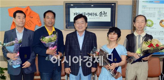 순천시는 지난 25일 시장실에서 ‘2014 국민행복 고령자 IT 전남 경진대회’ 입상자에 대한 시상식을 가졌다.<br /> <br /> 시상식에는 조충훈 시장을 비롯한 IT경진대회 입상자 4명이 참석했다.<br /> <br /> 수상자는 신만호 어르신이 문서작성 부분에서 금상, 김경숙, 오기순 어르신이 인터넷활용부분에서 각각 만점으로 공동 금상을 수상했으며, 이대일 어르신이 동상을 수상했다.<br /> <br /> 한편, 2014 국민행복 고령자 IT 경진대회는 지난달 16일 여수 한영대학에서 15개 시?군에서 55세 이상 어르신 89명이 참석해 정보검색, 문서작성, 인터넷활용 3개 분야에서 금?은?동 3명씩 총 9명이 입상했다.<br />