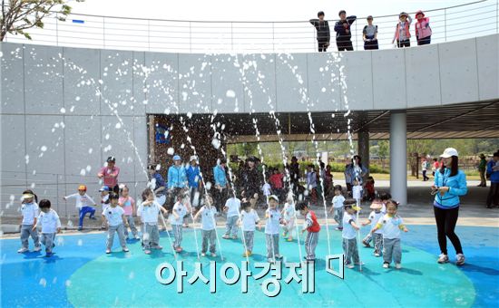 순천만정원 국제습지센터 옆 바닥분수에서 솥아 오르는 물줄기를 보고 아이들이 환호성을 지르고 있다.<br /> <br /> 순천만정원 내 물놀이 체험은 생태체험장, 어린이정원, 동천 등 4개소에서 운영하고 있다. <br /> <br /> 동천 수상자전거는 지난 21일부터 운영, 하루 300여 명 이상이 이용, 가족단위 관광객들에게 호응을 얻고 있다.<br /> <br /> 한편 지난 4월 20일 영구 개장한 ‘순천만정원’은 개장 62일 만에 관광객 100만 명을 돌파, 남도의 작은 도시 순천을 명실상부한 대한민국 대표 정원 및 힐링도시로 거듭나게 하고 있다.<br />